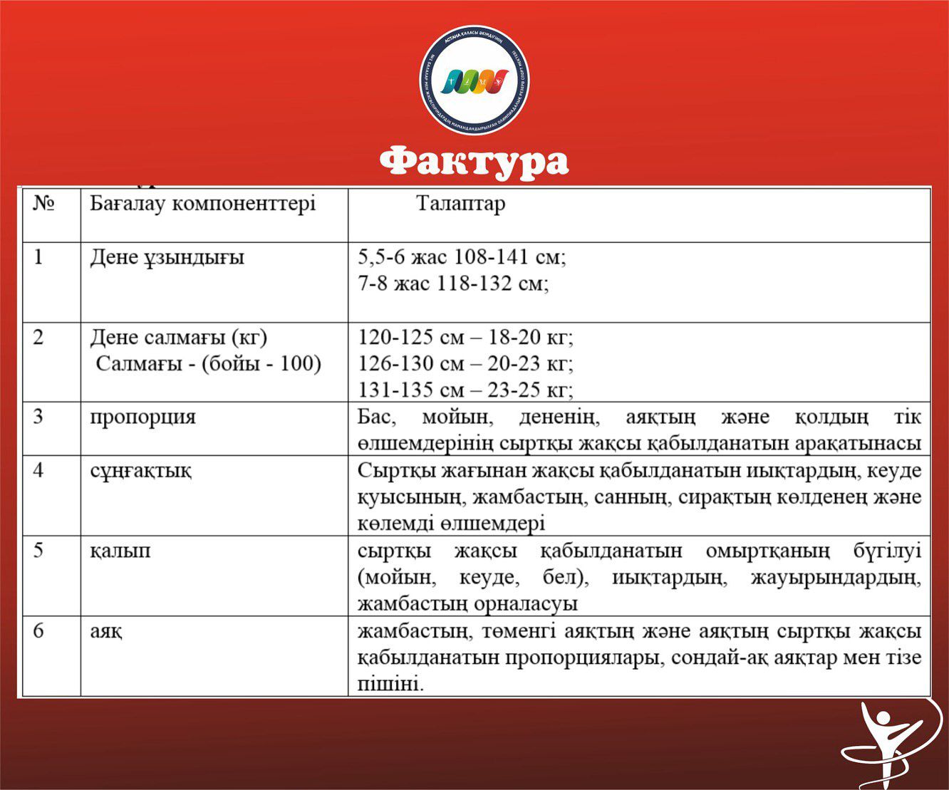 ЖАЛПЫ ЖӘНЕ АРНАЙЫ ДЕНЕ ШЫНЫҚТЫРУ ДАЯРЛЫҒЫ БОЙЫНША КӨРКЕМ ГИМНАСТИКАДАН БАСТАПҚЫ ДАЯРЛЫҚ КЕЗЕҢІНДЕГІ ТОПТАРҒА ҚАБЫЛДАУ НОРМАТИВТЕРІ