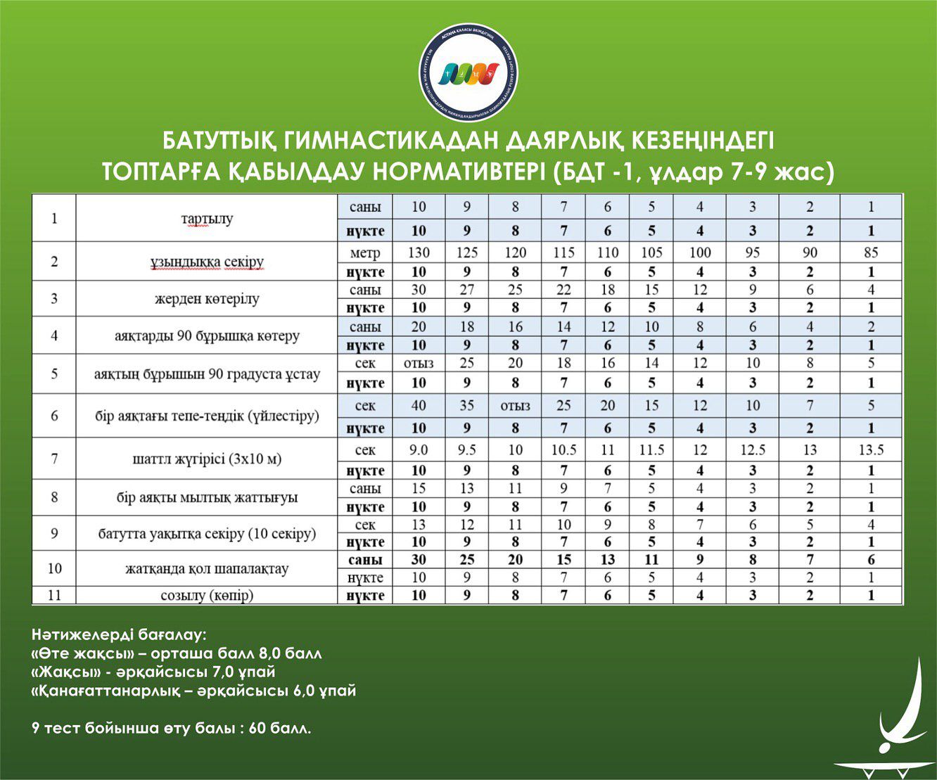 ЖАЛПЫ ЖӘНЕ АРНАЙЫ ДЕНЕ ШЫНЫҚТЫРУ ДАЯРЛЫҒЫ БОЙЫНША БАТУТТЫҚ ГИМНАСТИКАДАН БАСТАПҚЫ ДАЯРЛЫҚ КЕЗЕҢІНДЕГІ ТОПТАРҒА ҚАБЫЛДАУ НОРМАТИВТЕРІ